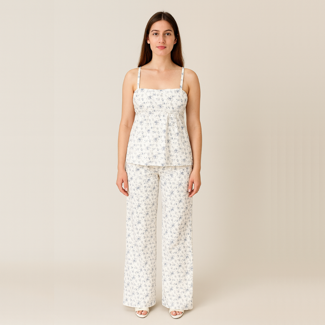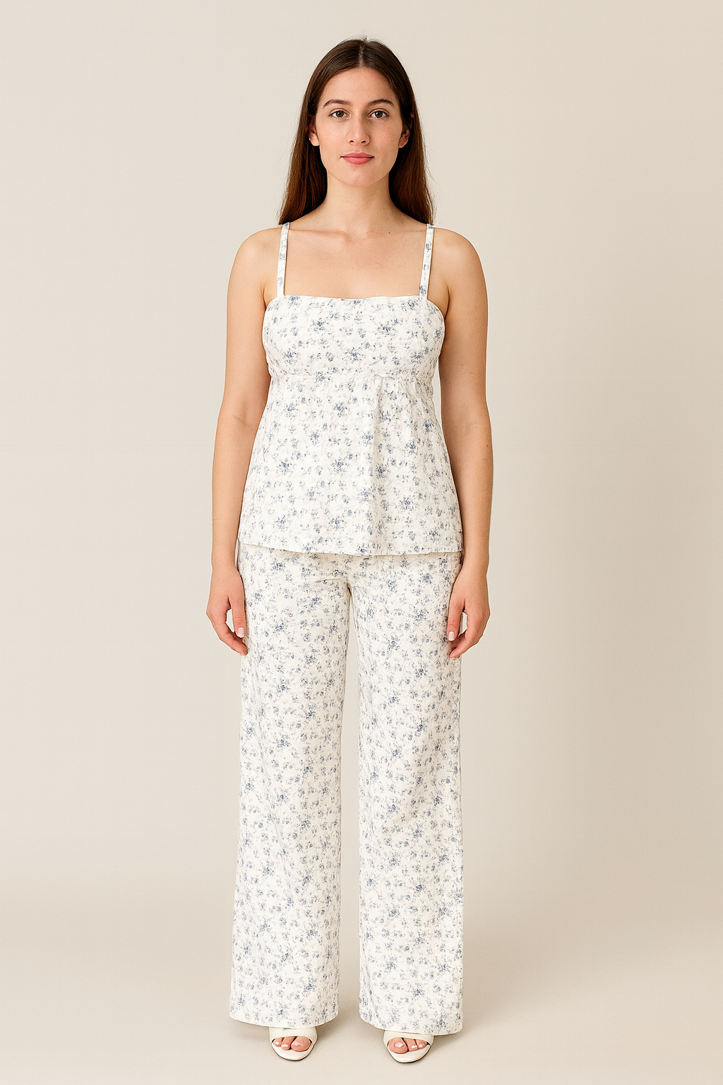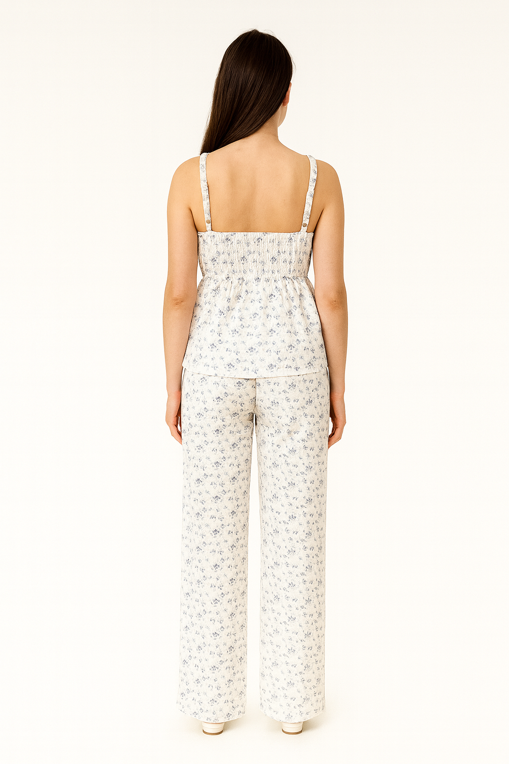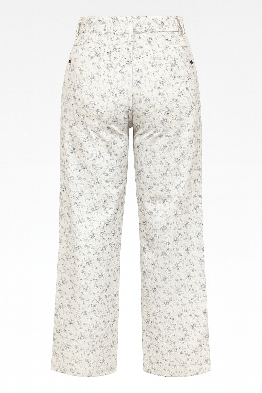 Tecido: Jeans Off White com estampa floral delicada em tons de azul. Ajustada no quadril e pernas que descem de forma reta. Bolso funcionais frente e costas.