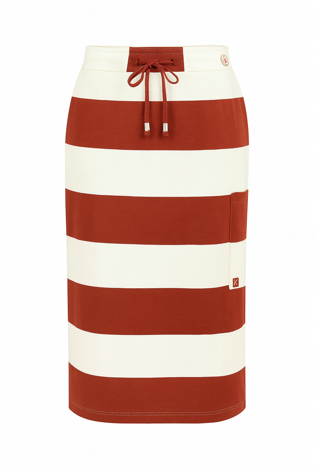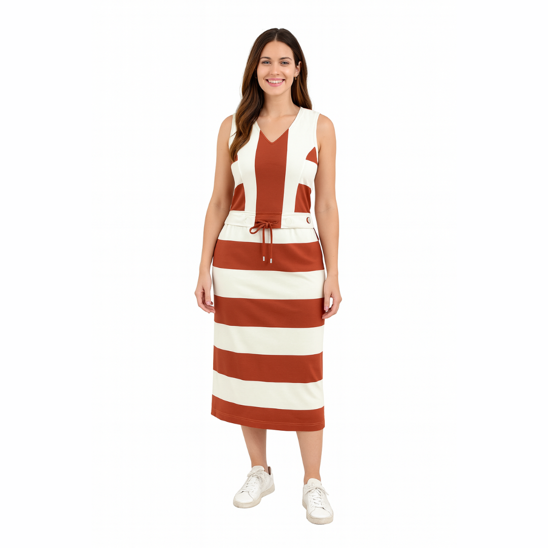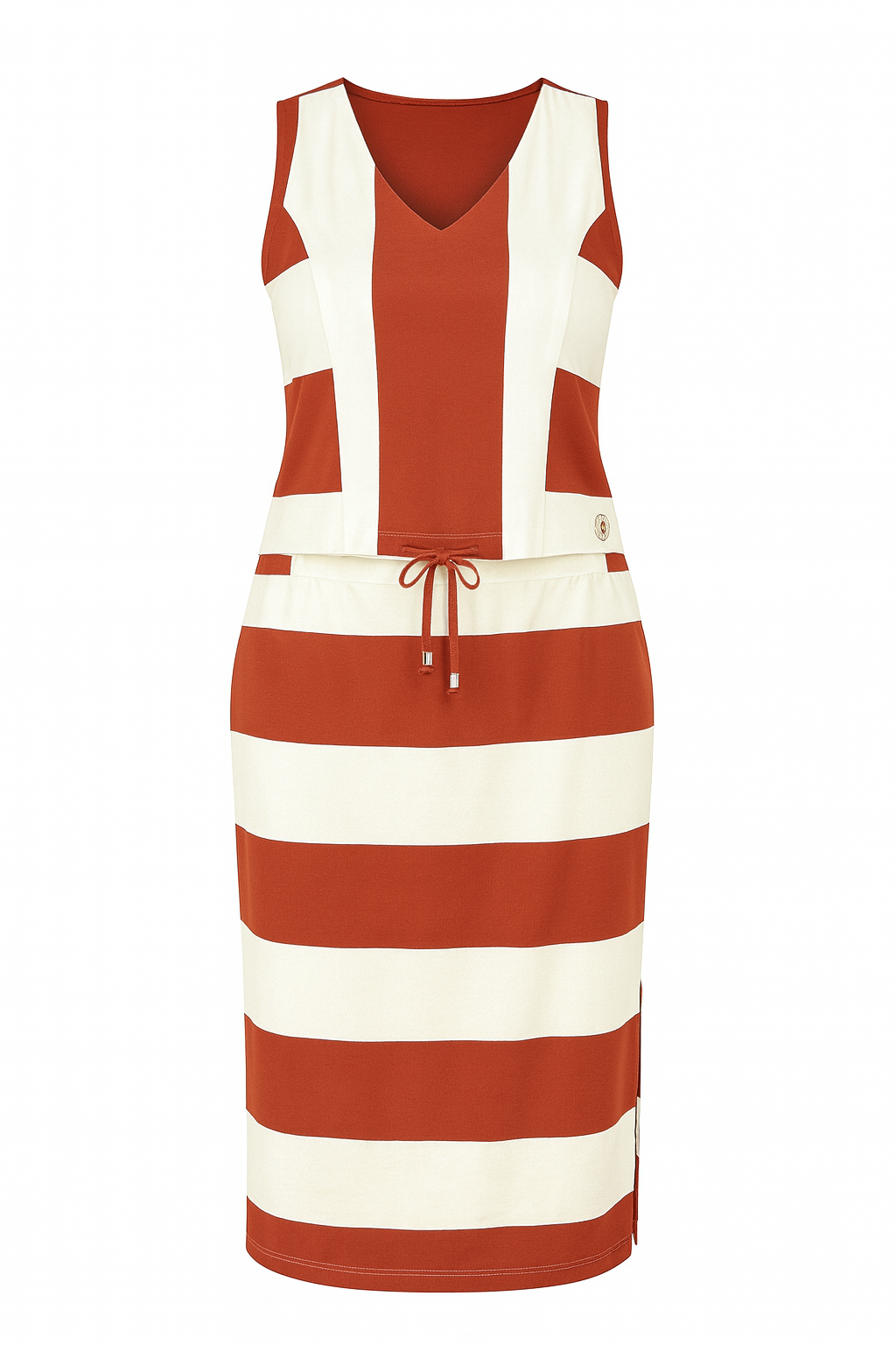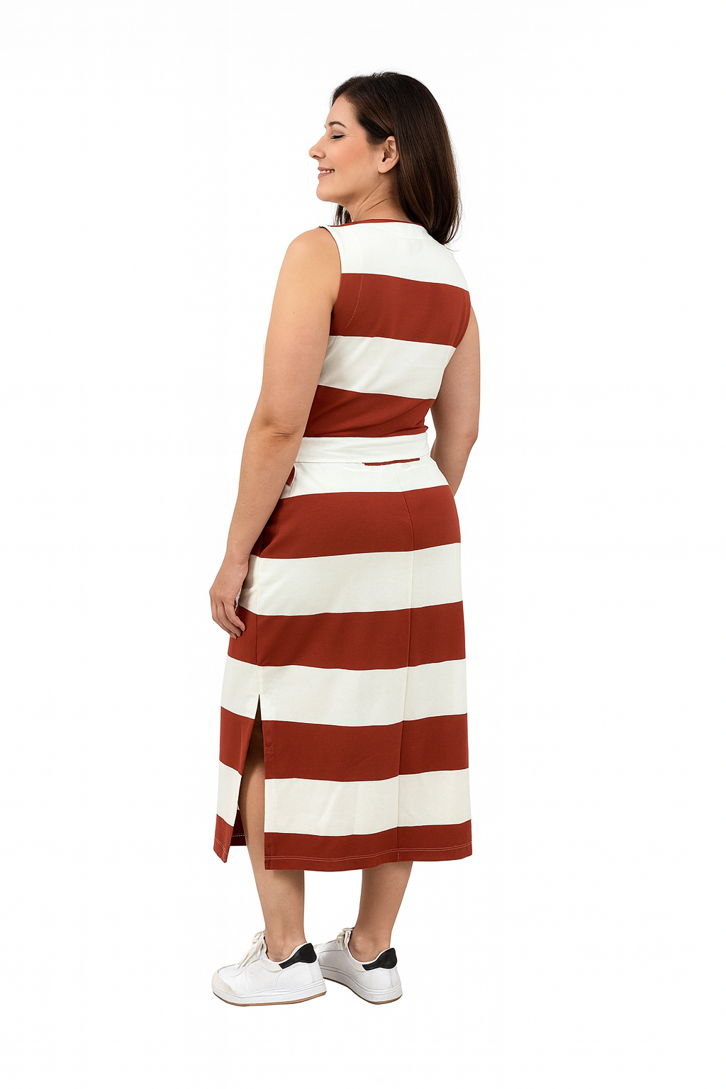 Em até 6x de R$ 100,72 sem juros À vistaR$ 574,09no Pix Blusa sem mangas, com alça larga que comporta o sutiã, tem decote V e comprimento que sobrepõe o cós da saia que é todo com elástico. A saia é midi com fendas nas laterais, bolsos e laço ilustrativo na cintura. O visual um mix listras, dispostas em formas verticais e horizontas.